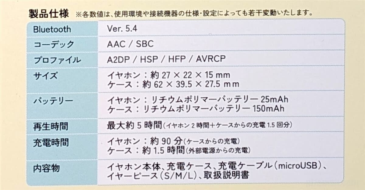 イヤホンの連続再生時間は、ちょっと控えめの約2時間表記。