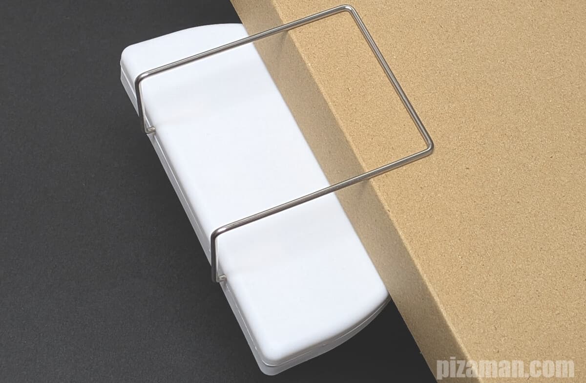 取り付け手順としては、白い樹脂部分と金属パーツの間に、デスクを挟むだけ。